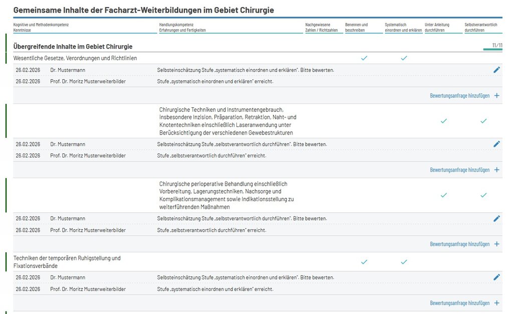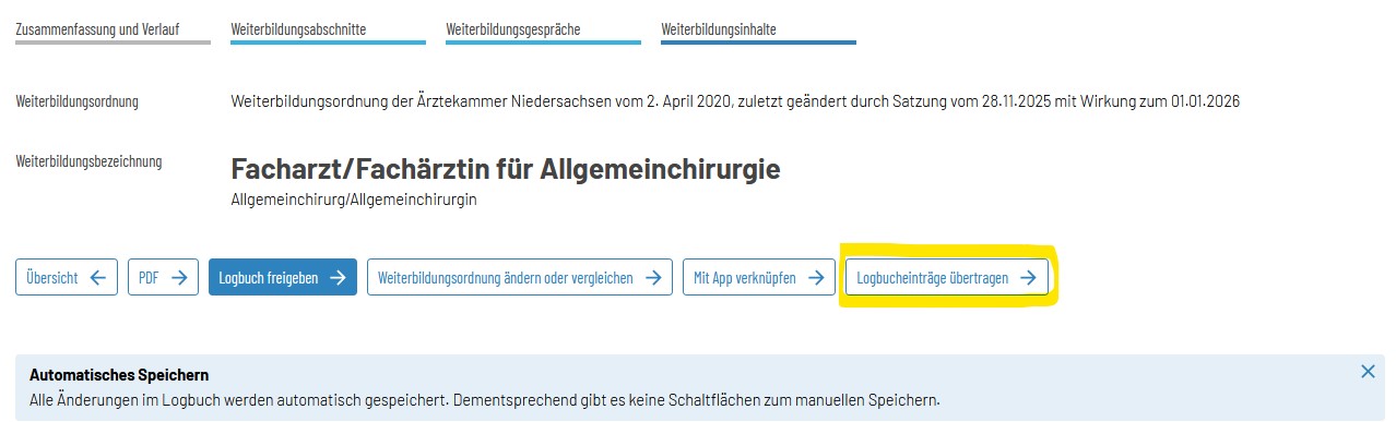 eLogbuch kann ab sofort bereits dokumentierte und bestätigte Inhalte aus einer Fachrichtung aus den Gebieten Chirurgie und Innere Medizin aus dem Abschnitt “Gemeinsame Inhalte der Facharzt-Weiterbildungen im Gebiet Chirurgie bzw. Innere Medizin” in ein Logbuch dieser Gebiete importieren: