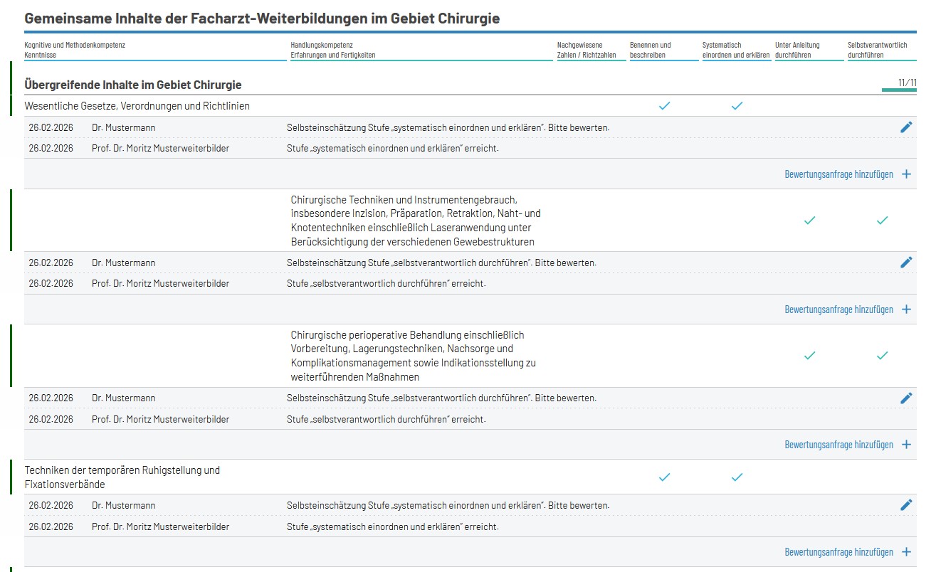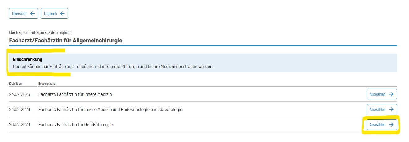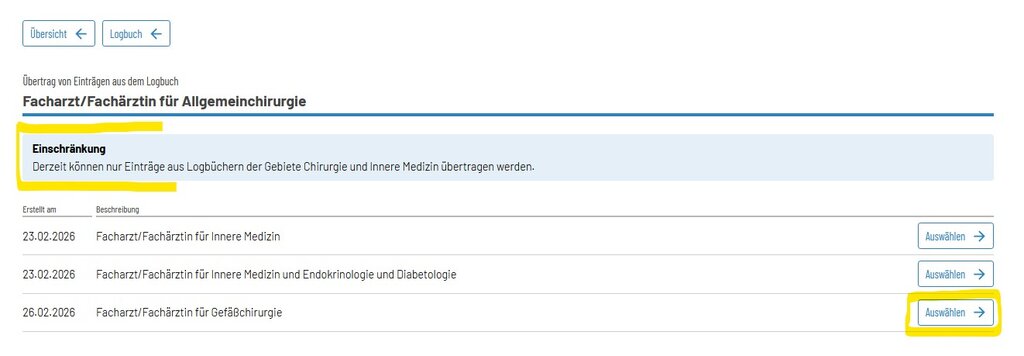WBA erstellt nun z. B. Logbuch aus dem Gebiet Chirurgie das Logbuch Gefäßchirurgie und möchte die bereits im Logbuch Allgemeinchirurgie bestätigten Inhalte in dieses Logbuch übernehmen.