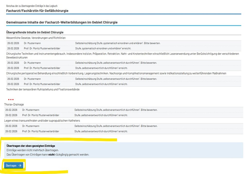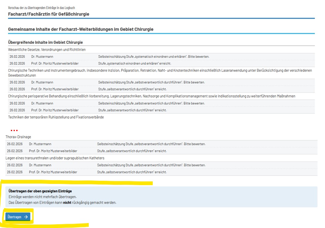 Beispiel: Einträge im Logbuch Allgemeinchirurgie, welche übertragen werden sollen: