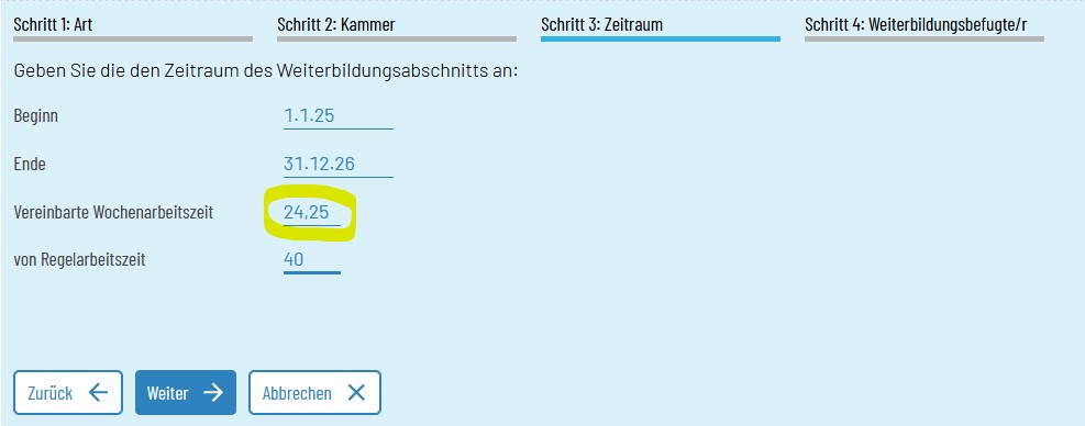 In die Anwendung wurde eine „Schritt-für-Schritt“-Nutzerführung integriert. Informationen finden Sie in dem neuen FAQ Weiterbildungsabschnitt anlegen und Weiterbildungsbefugte (WBB) hinzufügen